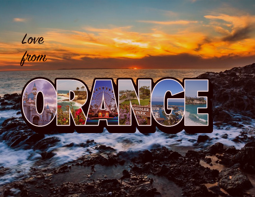 A beautiful beach-themed postcard of the wonderful landmarks of Orange County, California.